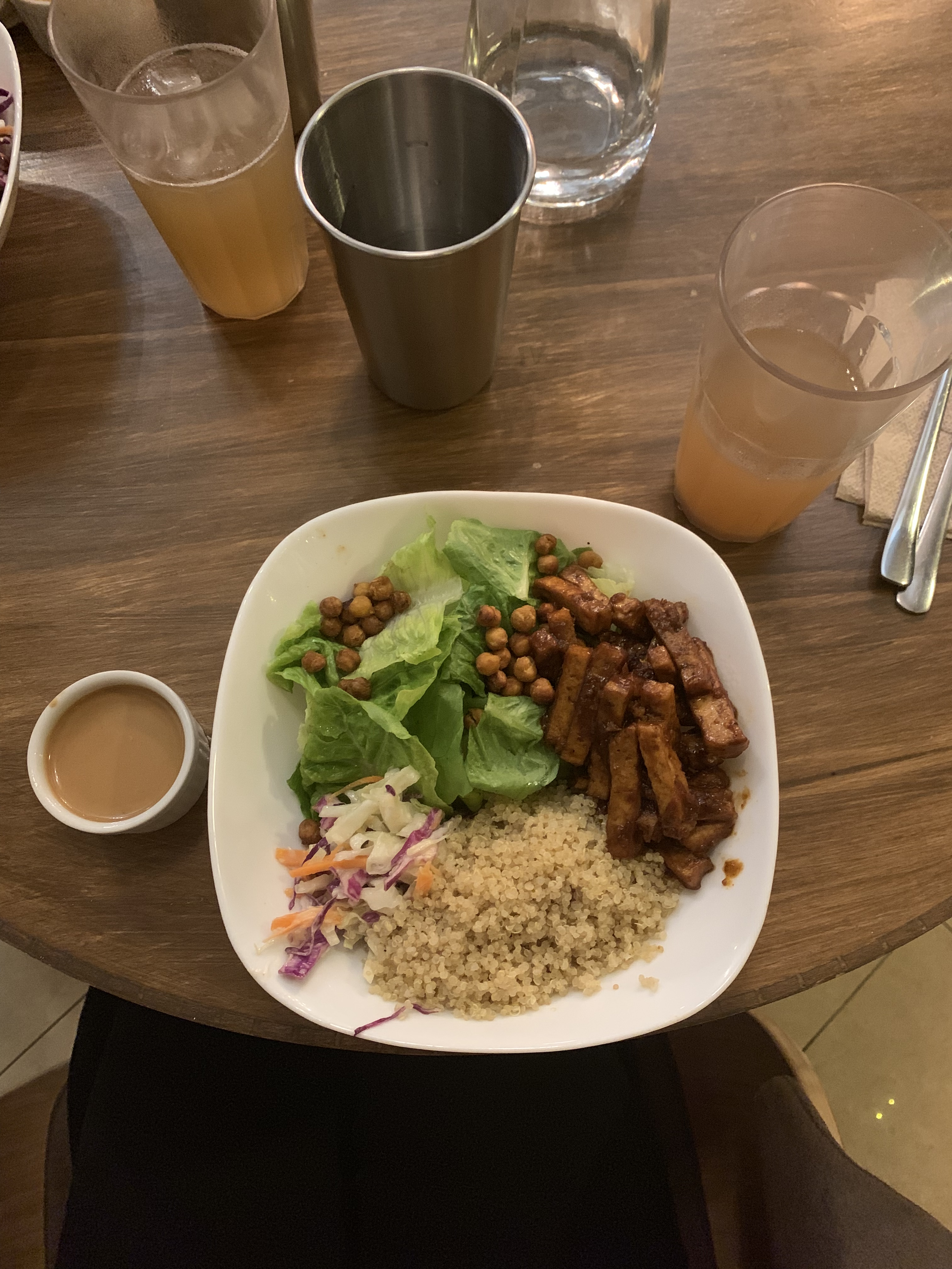 I have been vegan for just over one and a half years, so I had a very good idea going into my trip of what I do and do not eat. Luckily for me, I knew that my apartment had a microwave, hot plate, and rice cooker (of course), so I could always cook my own food to ensure it was vegan. But, with a country that loves food at all times of the day, I didn’t want to miss out on that part of the culture. Luckily, I didn’t have to. The city I work in is called Makati City which is part of Metro Manila and actually provides so many vegan options, I was shocked. Even at restaurants that don’t appear to have any on the menu, you can always just order vegetables without meat and a side of rice (this has become a staple), that way you don’t sacrifice good conversations and memories with friends. Around the corner from where I work is this all vegan restaurant called Cosmic, a little hidden gem above a Mini Stop in Poblacion, Makati. The restaurant has no sign indicating what it is from the outside and in order to get inside you have to go up (what appears to be) a sketchy staircase. If I hadn’t gone with friends the first time, I would have been so lost! But trust me, this place is so good. They offer authentic Filipino dishes made completely vegan. From Kare Kare, to Sisig, to Adobo, they have it all, and it is all so delicious. The best part is it is very affordable. My average meal there is around 200 pesos ($4 USD). My meat-eater friends choose to eat here on their own as well, so not only is it good vegan food, it’s good food in general. One thing that is surprisingly prevalent around me is falalfel. Falafel is originally a Middle-Eastern dish made of deep-fried chickpeas and spices and for whatever reason, there are a ton of restaurants that serve it near me. I have Hummus Elijiah, Yalla Yalla, and Beni’s Falafel all within a 5 minute walk, so I probably have a falafel sandwich 3 times a week (at least), but I’m not complaining. If falafel isn’t your thing, these places all also serve hummus and baba ganoush (also known as moutabal, it’s basically an eggplant puree with similar consistency to hummus), and other eggplant dishes. All of these wraps are also less than 200 pesos. Other good restaurants are Corner Tree Cafe, Kismet Cafe and Green Bar. Corner Tree Cafe is a little bit more expensive, and Kismet Cafe is more breakfast-type food and coffee, but they also have sandwiches. Their vegan chocolate chip pancakes are so yummy! Green Bar’s menu is entirely plant-based so I was basically in heaven when I ate there.